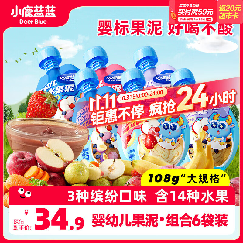 小鹿蓝蓝 婴标果泥婴幼儿果泥6包648g宝宝新鲜水果泥3种口味婴儿辅食