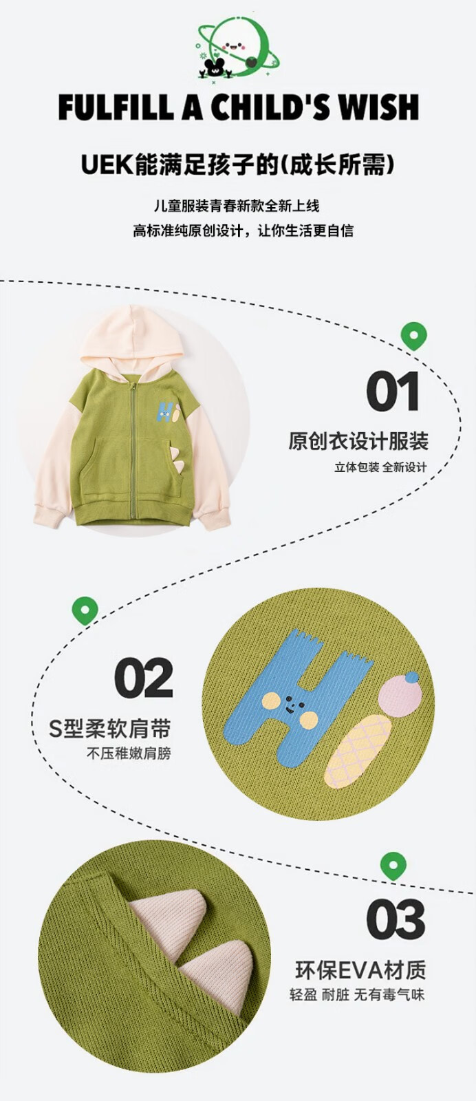原创设计,让你生活更有趣味,给孩子更多的选择,柔软舒适的面料,轻盈耐脏,无有毒有害物质,满足宝贝的天性。连帽的款式,时尚百搭,可释放出活泼的童年。时尚百搭的绿色上衣,可释放出孩子们的天性,让你生活更有自信。柔软的肩带设计,给宝贝带来更多的活动空间。高标准的缝纫工艺,从细节之处彰显品质感。这款连帽外套采用了环保的材质制作而成,轻盈耐脏,无有毒的气味,可释放出孩子们的天性。柔软的肩带设计,让宝贝的生活变得更加的自信,时尚百搭。长袖款式的一款外套,柔软舒适的面料,呵护孩子娇嫩的肌肤。时尚简约的设计风格,百搭又时髦,让你轻松成为街头的焦点。环保材质制作而成,轻盈耐脏。森林系的儿童长袖外套,精选优质的环保材质制作而成,具有良好的耐脏性,可释放出孩子的活力,原创的设计,让你的生活更加的自信。连帽的款式,时尚百搭,趣味感十足。